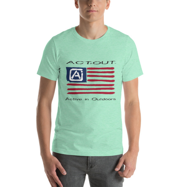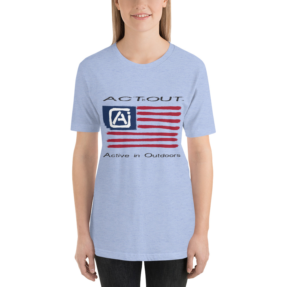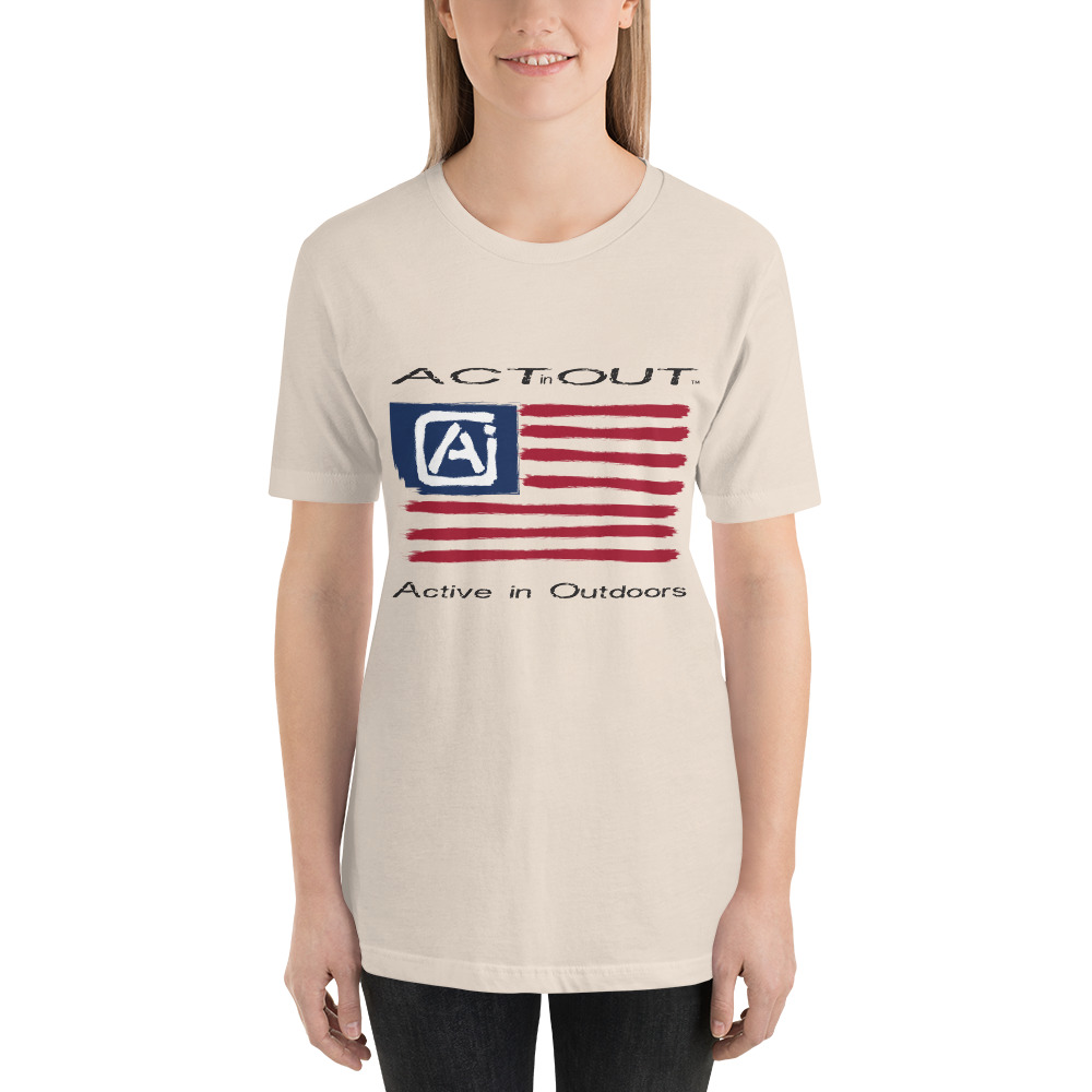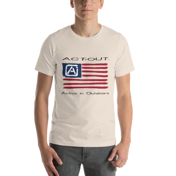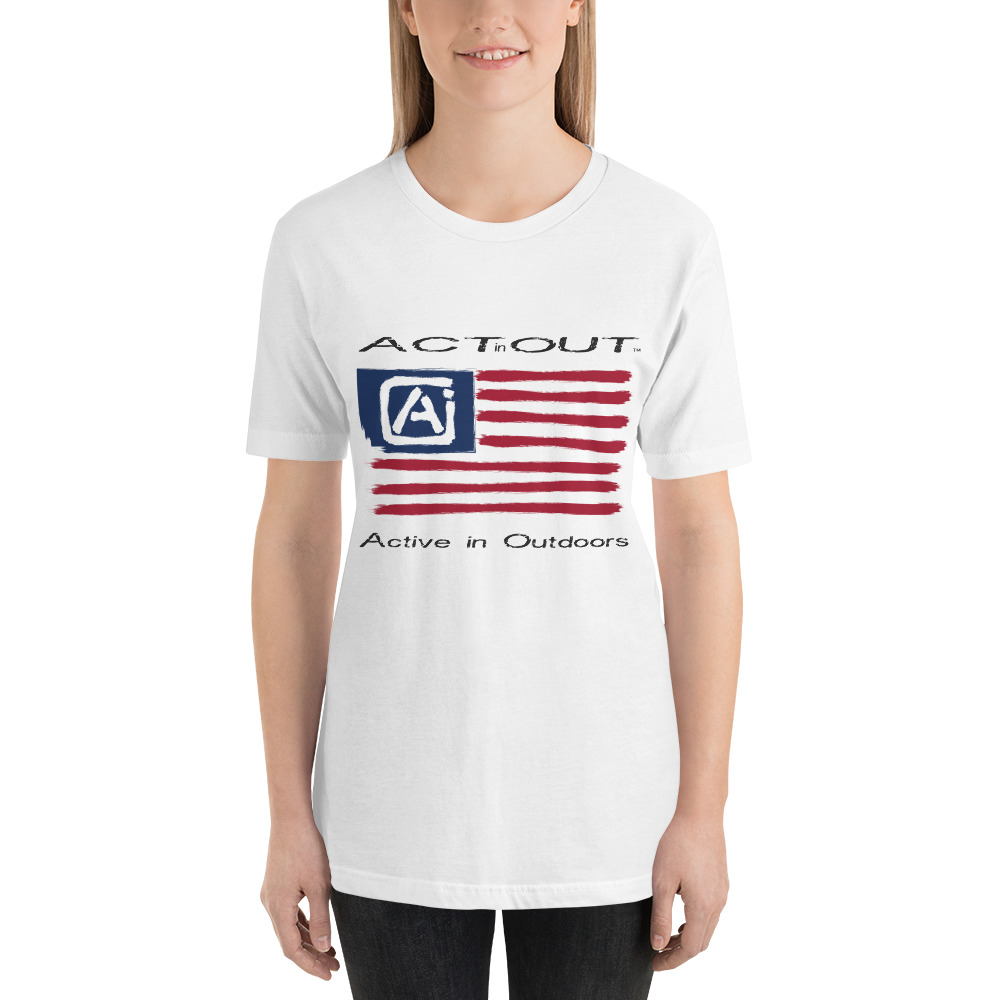 Express your patriotism and love of being Active in Outdoors with this ActinOut t-shirt featuring the American Flag and ActinOut verbiage and logo